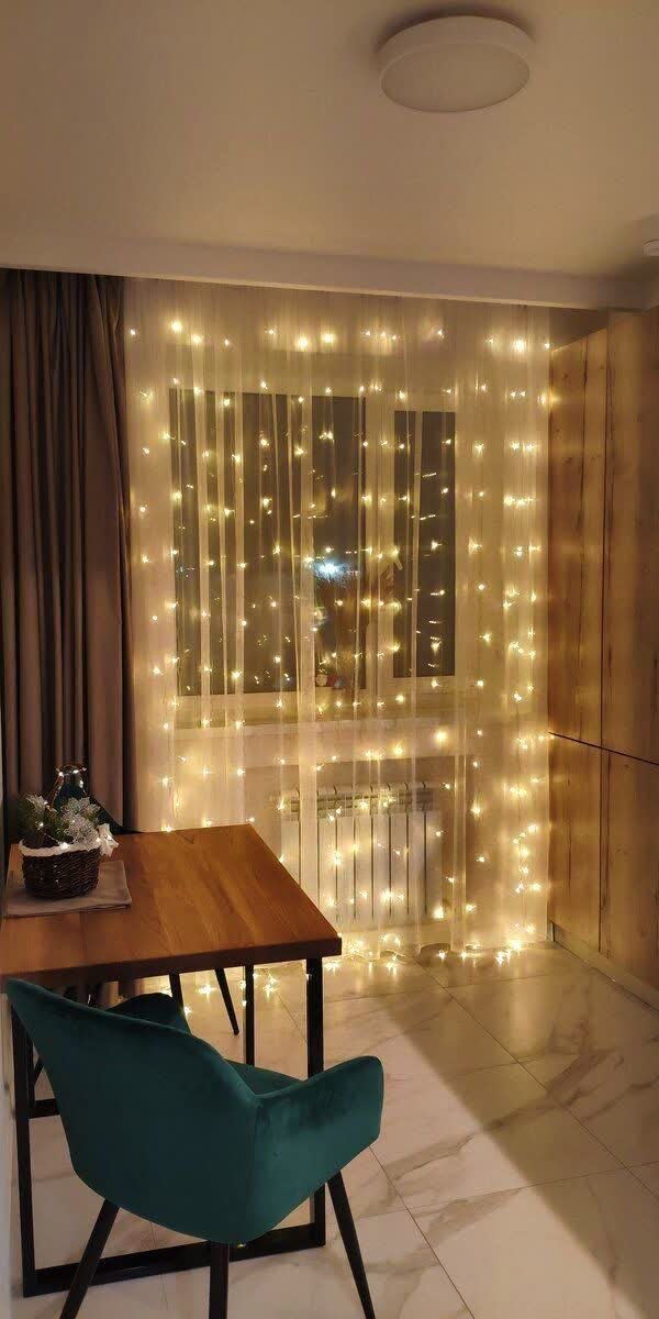 این ریسه با طراحی پردهای و ۱۶ آویز نورانی، بهسادگی روی پرده یا دیوار نصب میشود و با نورهای ملایم و قابل تنظیم، فضایی گرم و دلنشین ایجاد میکند.