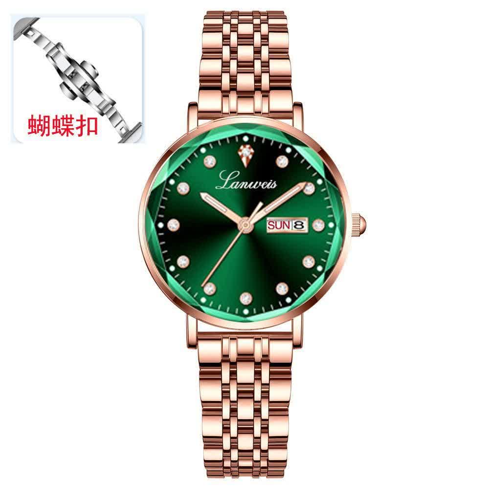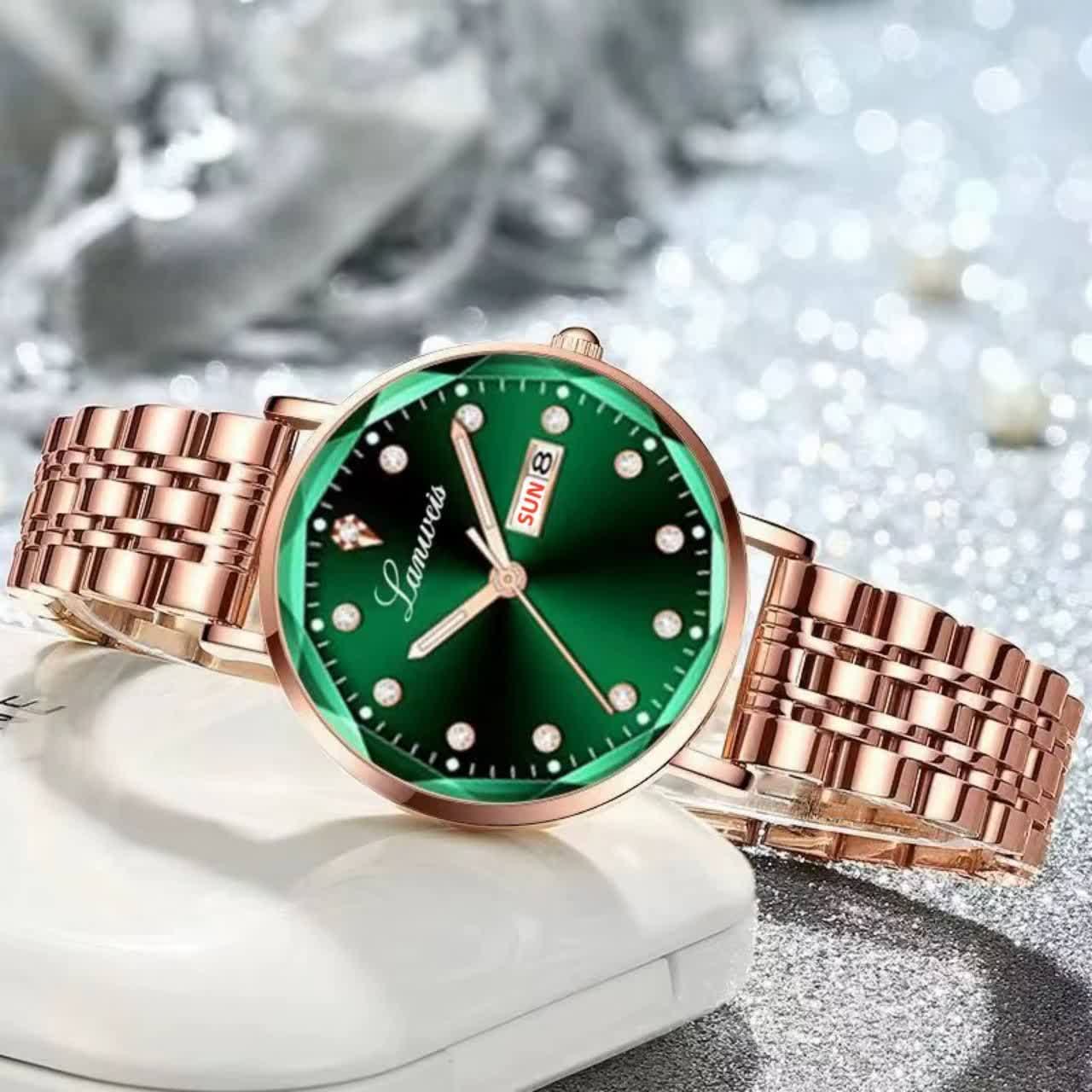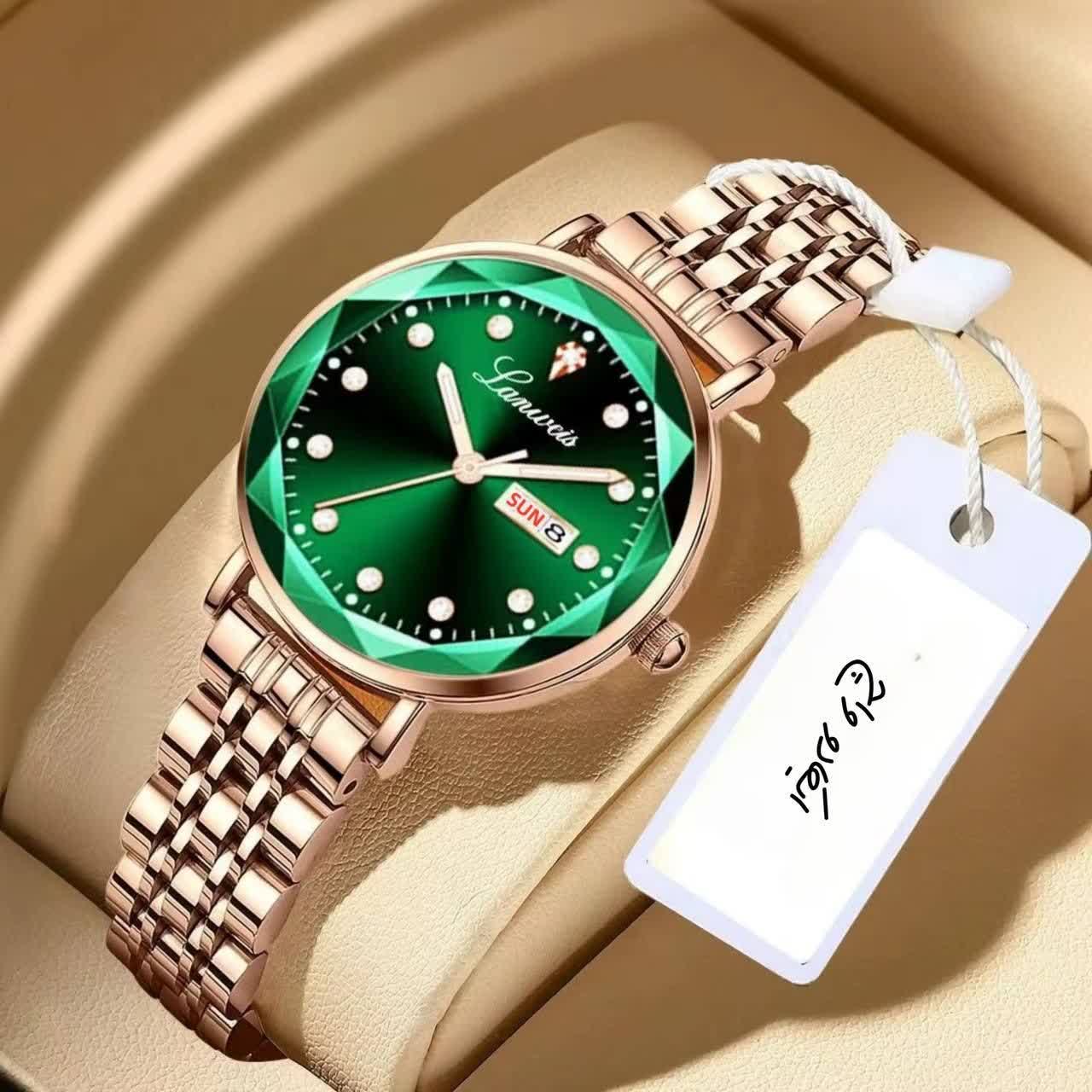 ساعت مچی زنانه Lanvinse مدل 1170، جلوهای از ظرافت و ماندگاری را در کنار هم ارائه میدهد. طراحی جذاب با قاب و بند استیل رنگ رزگلد و صفحه در دو رنگ سبز و سفید، آن را به انتخابی شیک برای استفاده روزمره و همچنین مهمانیها تبدیل کرده است.